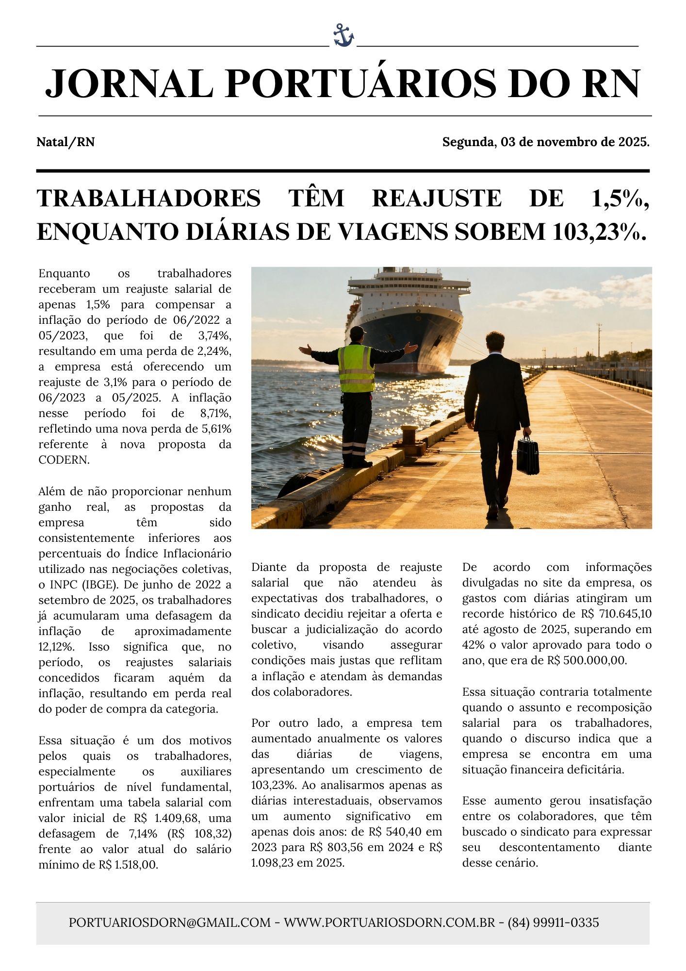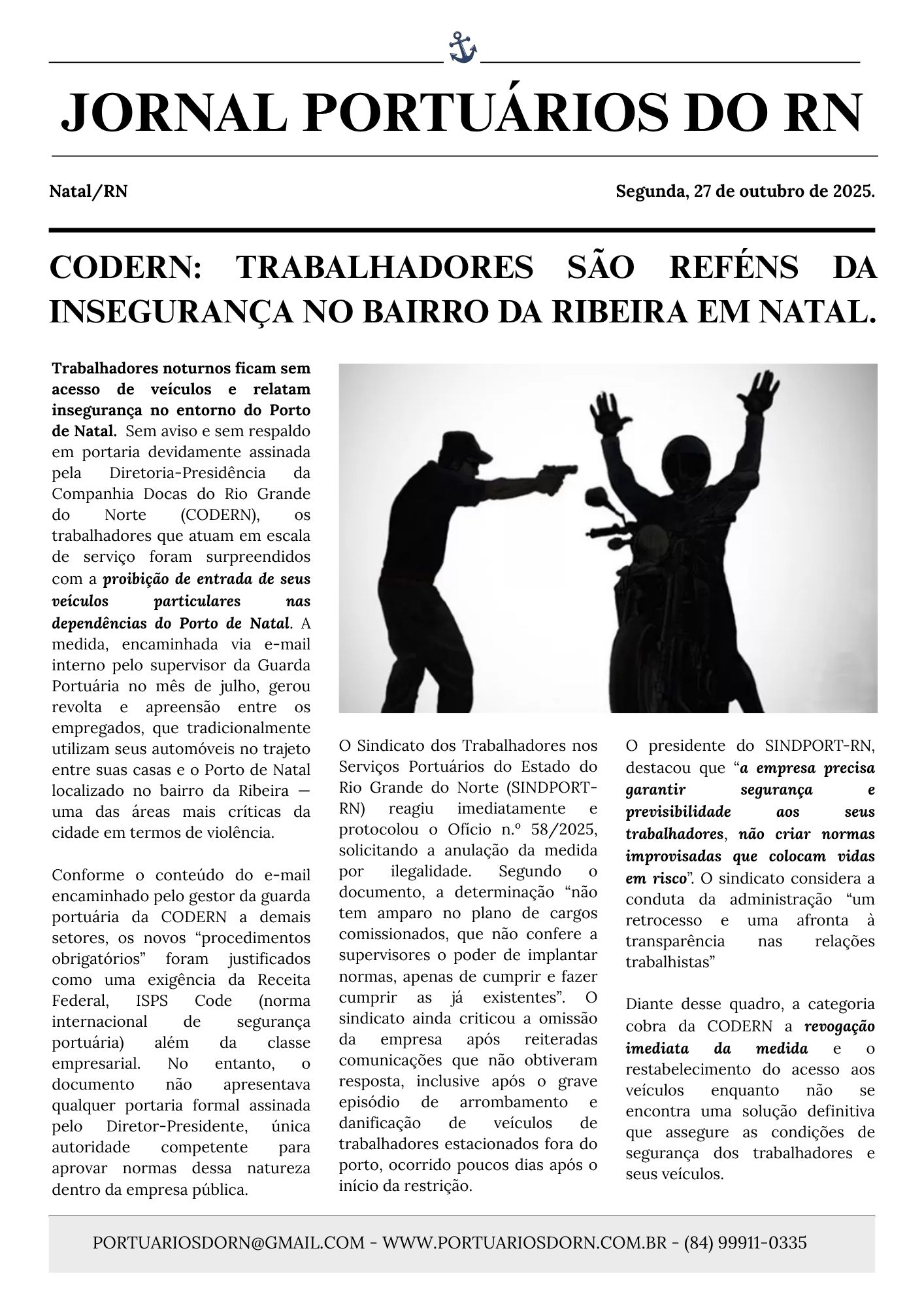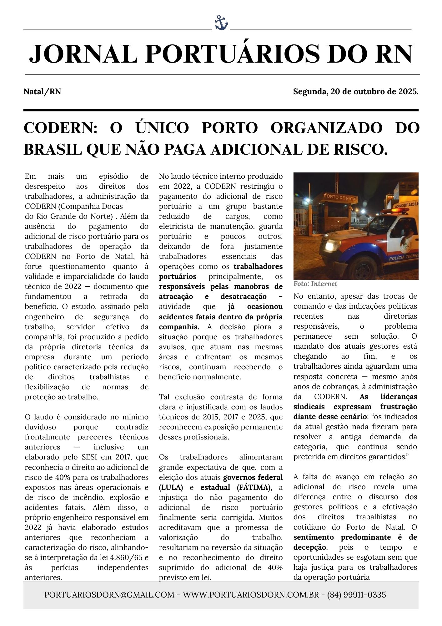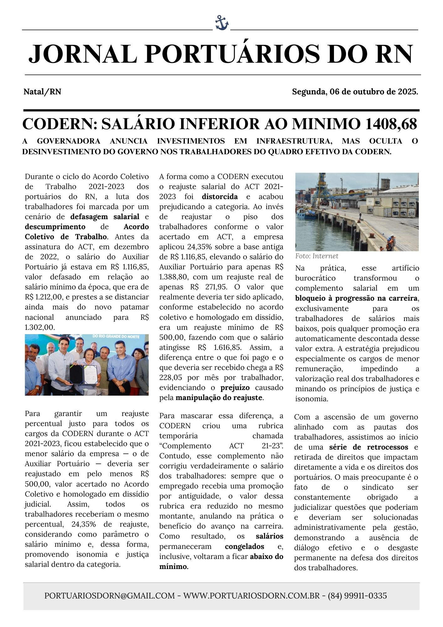<strong> SINDICATO DOS TRABALHADORES NOS SERVIÇOS PORTUÁRIOS </strong><strong>DO ESTADO DO RIO GRANDE DO NORTE - SINDPORT-RN</strong><br> Sede: Rua Esplanada Silva Jardim, 76 - Ribeira, Natal–RN, 59012-090<br> e-mail: <a href="mailto:portuariosdorn@gmail.com">portuariosdorn@gmail.com</a> Site: portuariosdorn.com.br<br> Contato(84) 9.9911-0335 CNPJ: 08.553.133/0001.05